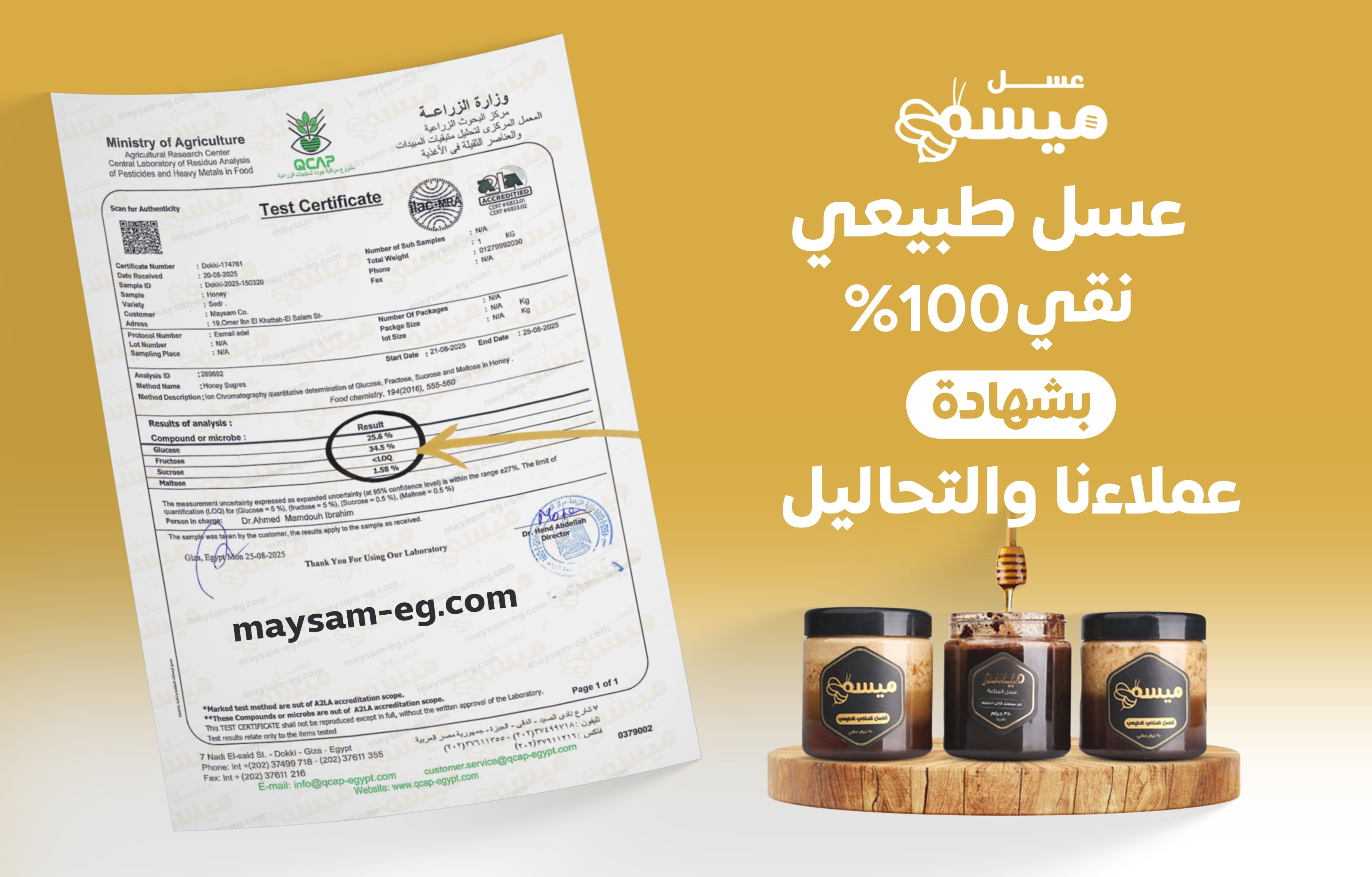 عسل نقي تمامًا، بدون أي إضافات أو مواد حافظة، مع ضمان مطابقته لأعلى معايير الجودة